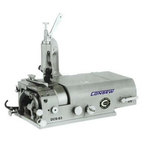 The Consew DCS-S4 Skiving or Scarfing Machine contains a variety of features the include, but not limited to: Fortuna-type knife, shoe & plate; Skiving width up to 2"; Waste removing device; Separate clutch for engaging the knife sharpener prolongs the life of the knife and sharpening stone; Removes the backing off of leather.