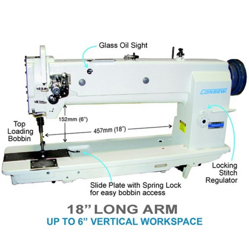 The Consew P1255RBLH-18 Long Arm Sewing Machine with Table and Servo Motor contains a variety of features the include, but not limited to: drop feed, needle feed, walking foot and is a high quality lockstitch machine with up to 6" vertical working space.