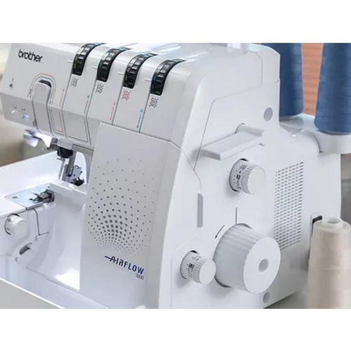 Excellent for challenging fabrics such as fine knits and stretchy materials, the Brother AIRFLOW 3000 Serger can achieve outstanding finishing touches with flatlock, overlock, and rolled hem stitches on most specialty fabrics. The modernistic AIRFLOW 3000 air threading serger can cut and finish seams all in one pass. It's a breath of fresh air to change threads as the AIRFLOW 3000 threading ports are connected to the end of each looper by tubes, and at the touch of a button, a blast of air sends the threads through the loopers, so it's a cinch to change thread colors.
